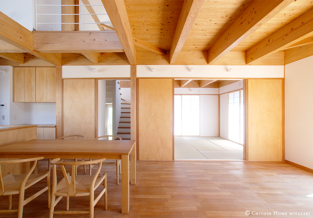 木の露出している範囲と、クロス貼りの範囲の両者のバランスを整えることで、全体のインテリアイメージを美しく凛とした雰囲気に演出。