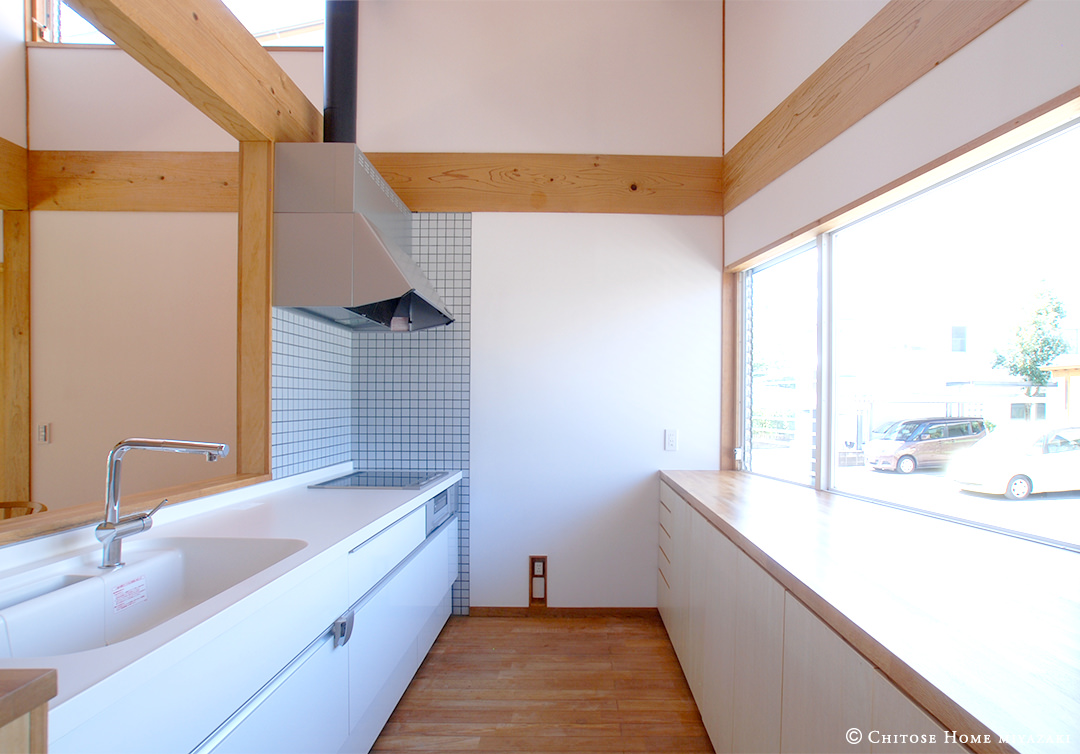 北側の窓から、柔らかな間接光を室内に効果的に採り込む。また、窓の下枠と造作カウンターの高さを揃えることでスッキリとした印象に。