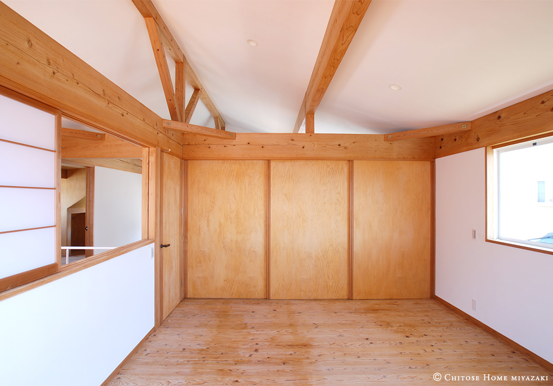 勾配天井を通じて、部屋間の天井をひと続きに。天井が個室の外へとひと続きに伸びていくことで開放感を得る。