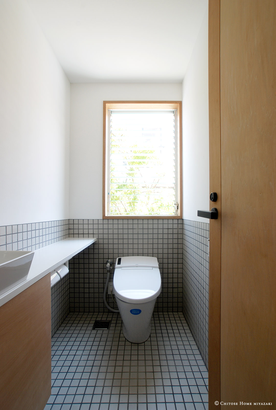 トイレのタイル貼り部分の上端を窓枠の下端に揃えることや、窓の横枠を壁の右端にぴったりと揃えることで整然とした印象を。