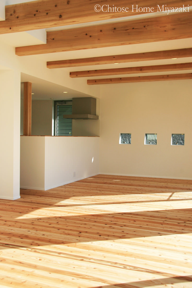 宮崎県産の杉無垢板をふんだんに使ったインテリア。手元の隠れる対面キッチンで個室感を演出。3連続の小窓は、ダイニング空間をポップな雰囲気に仕上げている。