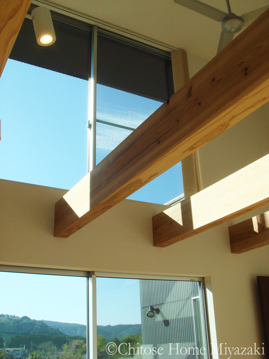 遮熱性能の高いサッシを標準装備しているため、吹き抜けで大空間を実現することが出来る。周囲の豊かな自然を、室内からも十分満喫できる大開口サッシを採用。