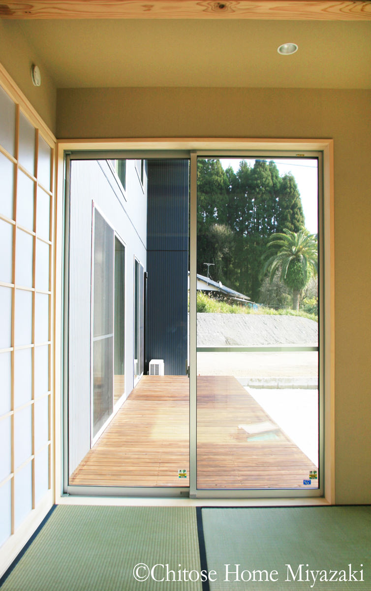 和室から伸びやかに拡がるウッドデッキ。玄関ホール~和室~デッキ~LDKという、一つの連続した空間構成になっている。