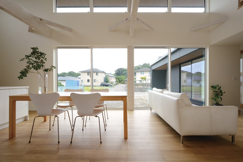 4.2mの高天井仕上げの広々としたLDK空間には、大開口サッシを連窓して開放的な空間に仕上げる。ご家族の憩いの空間に光と風を採り込む、自然の恵みを活かしたパッシブデザインの設計手法を実現。