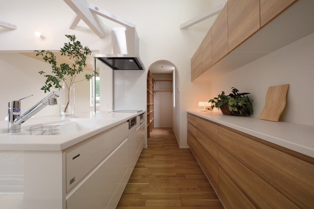 奥に大容量のパントリーを備え、爽やかな雰囲気と色合いでコーディネートしたアイランド型キッチン。